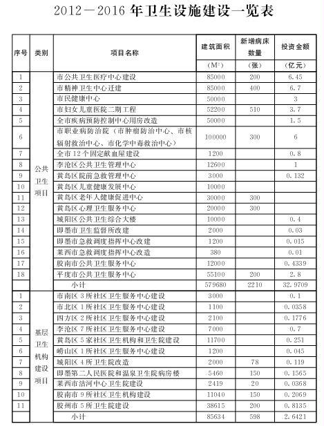 市南區(qū)建設(shè)3所社區(qū)衛(wèi)生服務(wù)中心,市北區(qū)建設(shè)1所社區(qū)衛(wèi)生服務(wù)中心,四方區(qū)建設(shè)2所社區(qū)衛(wèi)生服務(wù)中心,李滄區(qū)建設(shè)7所社區(qū)衛(wèi)生服務(wù)中心,黃島區(qū)建設(shè)5家社區(qū)衛(wèi)生機(jī)構(gòu)和衛(wèi)生院,嶗山區(qū)建設(shè)1所社區(qū)衛(wèi)生服務(wù)中心,城陽區(qū)改造4所衛(wèi)生院,即墨市建設(shè)第二人民醫(yī)院病房樓、溫泉衛(wèi)生院,萊西市建設(shè)沽河衛(wèi)生院,膠南市建設(shè)9所社區(qū)衛(wèi)生機(jī)構(gòu),膠州市建設(shè)5所衛(wèi)生院。