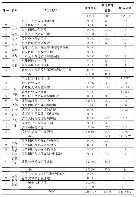 實(shí)施市北區(qū)??漆t(yī)療中心建設(shè)、城陽人民醫(yī)院病房樓擴(kuò)建、即墨市東部醫(yī)療中心建設(shè)、萊西市人民醫(yī)院門診綜合樓和市立醫(yī)院門診病房樓建設(shè)、膠南人民醫(yī)院綜合病房樓建設(shè)、膠州市新城區(qū)人民醫(yī)院建設(shè)等項(xiàng)目。