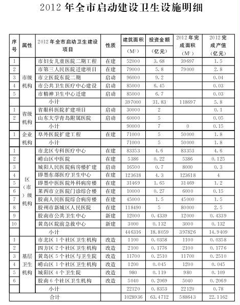 2012年開工建設(shè)衛(wèi)生設(shè)施項(xiàng)目24項(xiàng),計(jì)劃開工在建規(guī)模10289萬平方米,計(jì)劃總投資63.47億元。年底前計(jì)劃完成建設(shè)規(guī)模5886萬平方米,完成產(chǎn)值2212億元。主要包括以下幾個(gè)方面的項(xiàng)目: