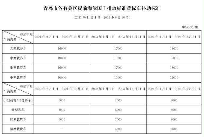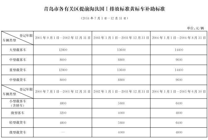 2.青島市各有關(guān)區(qū)提前淘汰國(guó)Ⅰ排放標(biāo)準(zhǔn)黃標(biāo)車補(bǔ)助標(biāo)準(zhǔn)(2014年7月1日—12月31日)