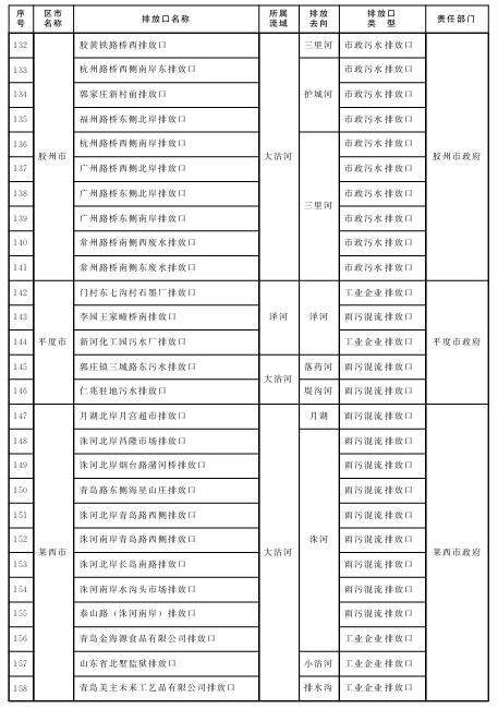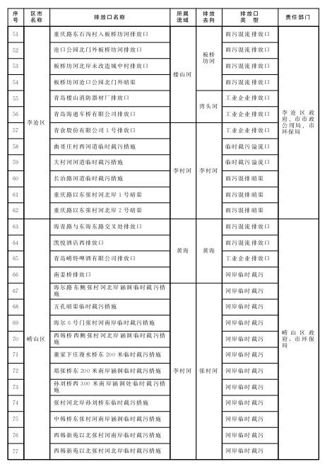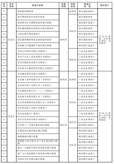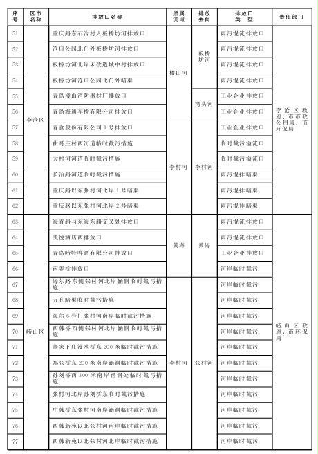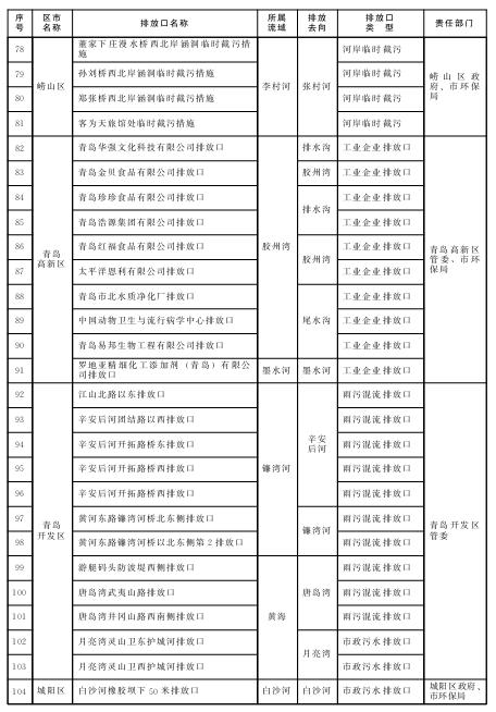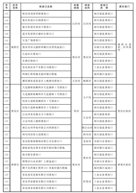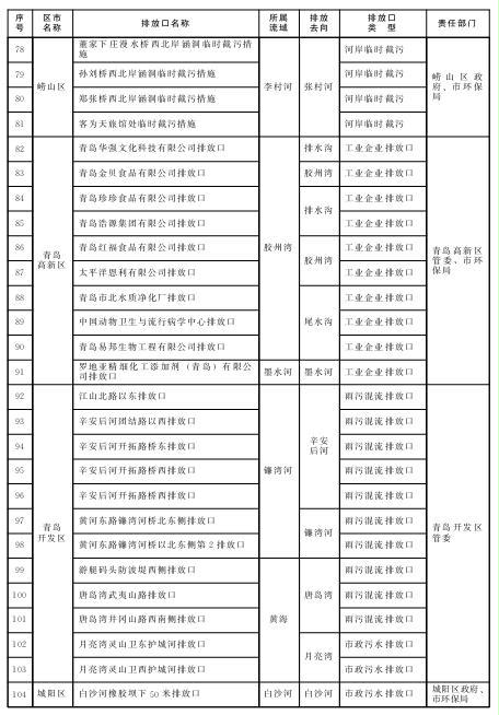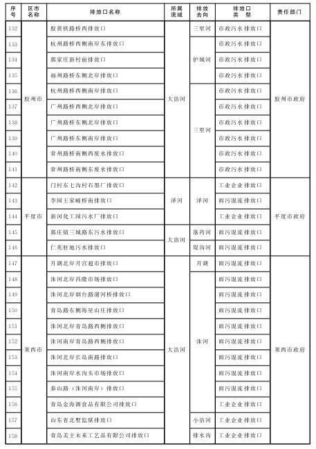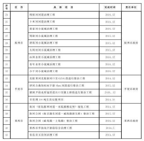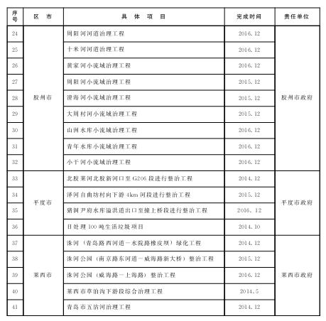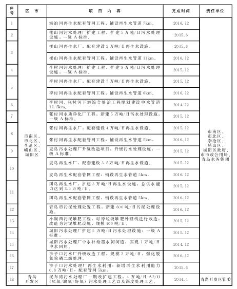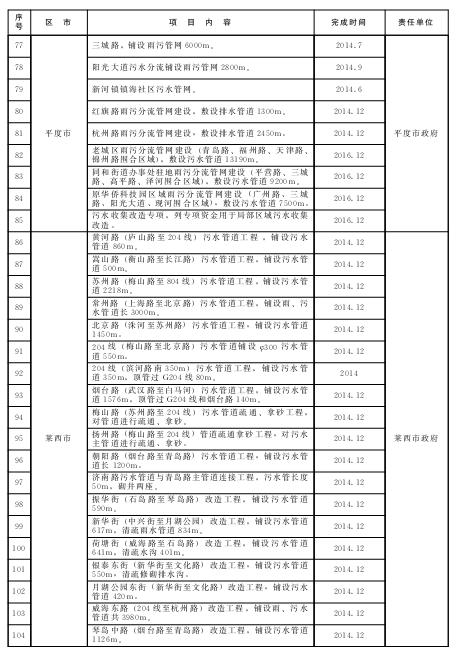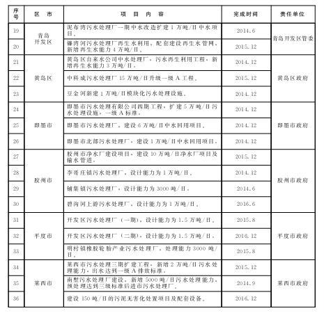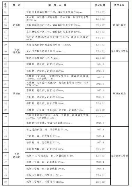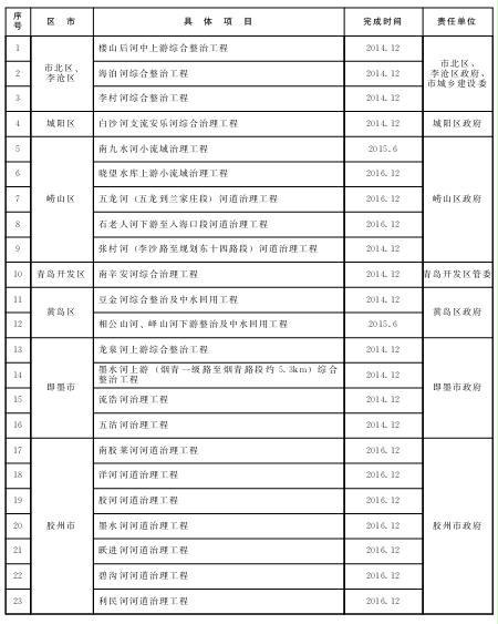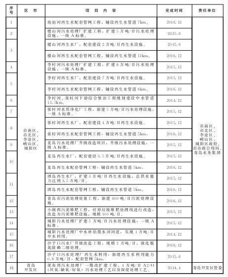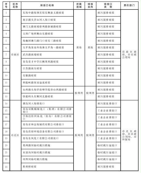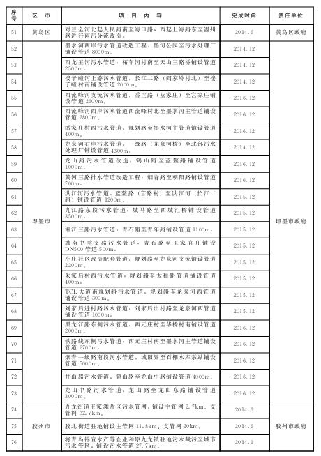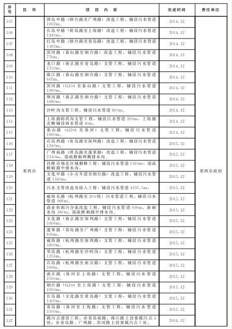 ?。ǘ┠繕?biāo)要求。按照省委、省政府提出的解決城市(含縣城)建成區(qū)污水直排環(huán)境問(wèn)題的有關(guān)目標(biāo)要求,以解決污水直排環(huán)境問(wèn)題為重點(diǎn),用3年時(shí)間全面實(shí)施全市河流污染整治工作。2014年,全面整治環(huán)膠州灣的污染河流;解決城區(qū)污水直排環(huán)境問(wèn)題,消除所有污水直排口。到2016年底,全市范圍內(nèi)主要河流水質(zhì)明顯改善,魚(yú)類(lèi)可穩(wěn)定生長(zhǎng);廢水排放重點(diǎn)企業(yè)達(dá)標(biāo)排放、100%實(shí)現(xiàn)遠(yuǎn)程監(jiān)控;膠州灣污染隱患基本消除。
