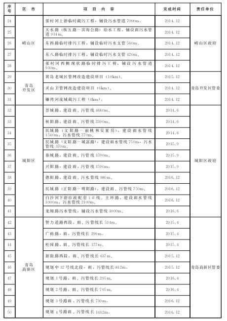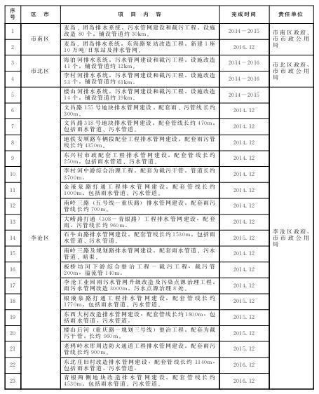 (一)整治污水直排口,2014年消除建成區(qū)污水直排現(xiàn)象。按照“實(shí)現(xiàn)雨污分流、污水納管、排放達(dá)標(biāo)”的基本原則制定整治方案,逐級(jí)分區(qū)落實(shí)治理責(zé)任,實(shí)行“零容忍”的目標(biāo)管理制度,到2014年底,全面完成158處污水直排口整治任務(wù),并實(shí)行動(dòng)態(tài)監(jiān)管,發(fā)現(xiàn)一處徹底解決一處。其中市南區(qū)、市北區(qū)、李滄區(qū)完成62處,需市區(qū)兩級(jí)財(cái)力安排投資2000萬(wàn)元,主要用于排污口及周邊環(huán)境綜合整治。