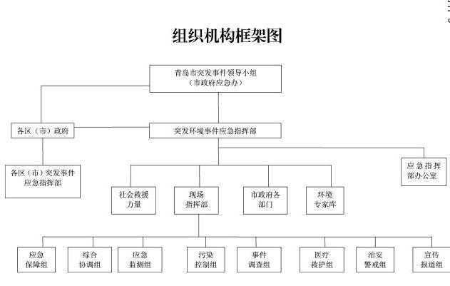 區(qū)(市)政府成立相應(yīng)的突發(fā)環(huán)境事件應(yīng)急組織體系,參照青島市突發(fā)環(huán)境事件應(yīng)急組織體系確定機(jī)構(gòu)單位及職責(zé)。