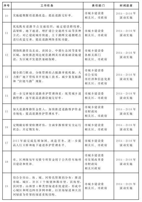 2.城市道路建設(shè)改造。以緩解城市交通擁堵為目標(biāo),加快建成環(huán)灣交通骨架路網(wǎng),圍繞以膠州灣為中心的海灣大橋和海底隧道“兩跨”,積極推進(jìn)新疆路高架等配套工程建設(shè),全面提升海灣大橋和海底隧道的交通功能;完善“功能明晰、通達(dá)有序”的環(huán)灣區(qū)域“四環(huán)”骨架道路體系,實(shí)現(xiàn)“青、黃、紅”城區(qū)快速交通銜接;加快快速路網(wǎng)建設(shè),優(yōu)化路網(wǎng)結(jié)構(gòu),形成大容量、高效率骨架路網(wǎng);加快打通、改造未實(shí)現(xiàn)規(guī)劃寬度的主干路,提升路網(wǎng)功能;逐步實(shí)施次干路和支路網(wǎng)加密,增強(qiáng)居民出行的便捷性;實(shí)施超期服役道路改造,提高道路完好率。優(yōu)化既有道路節(jié)點(diǎn)交通組織,通過建設(shè)跨線橋、高架橋、地下通道、增擴(kuò)建公交港灣車站等多種方式,對(duì)已建成城市快速、主干路網(wǎng)交通擁堵點(diǎn)進(jìn)行改造完善,提高道路網(wǎng)絡(luò)系統(tǒng)功能。圍繞鐵路青島北站、世園會(huì)、中德生態(tài)園等重要區(qū)域,加快推進(jìn)周邊配套路網(wǎng)建設(shè)和市政公用基礎(chǔ)設(shè)施建設(shè),為區(qū)域開發(fā)提供基礎(chǔ)保障。