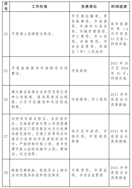 ?。ㄒ唬┩七M(jìn)依法治旅。完善綜合監(jiān)管機(jī)制,全面優(yōu)化旅游市場環(huán)境,強(qiáng)化“一日游”管理,開展海上旅游聯(lián)合執(zhí)法和旅游服務(wù)市場秩序?qū)m?xiàng)整治,運(yùn)用信息化手段努力提高旅游市場監(jiān)管、旅游執(zhí)法水平和投訴處理能力。建立健全旅游企業(yè)信用信息記錄和公告制度、服務(wù)等級退出制度、守信激勵和失信懲戒機(jī)制,加強(qiáng)行業(yè)自律和輿論監(jiān)督。著力提高旅游從業(yè)人員的文明意識、形象意識和環(huán)境意識,進(jìn)一步落實(shí)游客不文明行為記錄制度,積極開展旅游志愿者義務(wù)服務(wù),提升公民出游文明素質(zhì)。對利用風(fēng)景名勝區(qū)、自然保護(hù)區(qū)、文物保護(hù)單位等公共資源建設(shè)的景區(qū)及景區(qū)內(nèi)另行收費(fèi)的游覽場所、交通工具等項(xiàng)目價格實(shí)行政府定價或者政府指導(dǎo)價,嚴(yán)格控制價格上漲,逐步免費(fèi)開放公益性的城市公園、博物館、紀(jì)念館等。配套完善帆船、帆板及水上游樂活動的服務(wù)標(biāo)準(zhǔn)和規(guī)范體系。有效落實(shí)機(jī)場口岸72小時過境免簽政策和境外游客購物離境退稅政策。