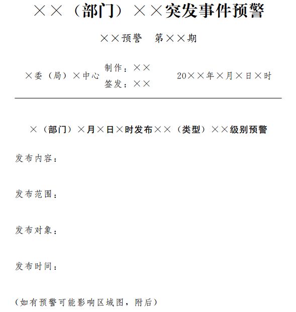 第九條 預(yù)警信息制作由預(yù)警信息發(fā)布責(zé)任單位負(fù)責(zé),主要內(nèi)容包括發(fā)布單位、發(fā)布時(shí)間、起始時(shí)間、預(yù)警類型、發(fā)生或可能發(fā)生的突發(fā)事件預(yù)警級(jí)別、可能影響范圍、警示事項(xiàng)、建議措施等,采用統(tǒng)一格式(見(jiàn)附件)。多部門聯(lián)合發(fā)布預(yù)警信息時(shí),需經(jīng)相關(guān)部門會(huì)簽同意,并由牽頭單位負(fù)責(zé)辦理。