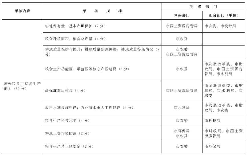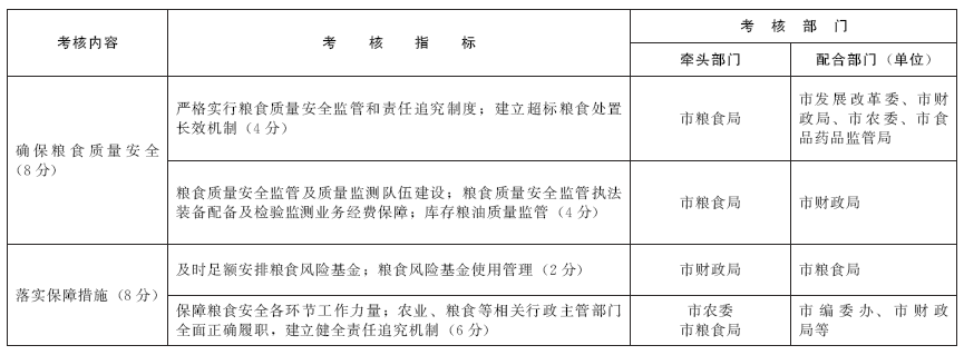 第五條 考核內(nèi)容包括增強(qiáng)糧食可持續(xù)生產(chǎn)能力、保護(hù)種糧積極性、增強(qiáng)地方糧食儲備能力、保障糧食市場供應(yīng)、確保糧食質(zhì)量安全、落實(shí)保障措施等6個(gè)方面,由各牽頭部門具體落實(shí)。(詳見青島市糧食安全責(zé)任考核表)