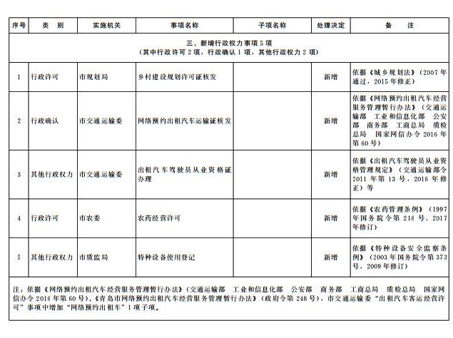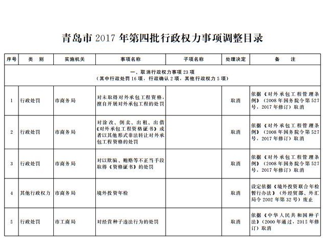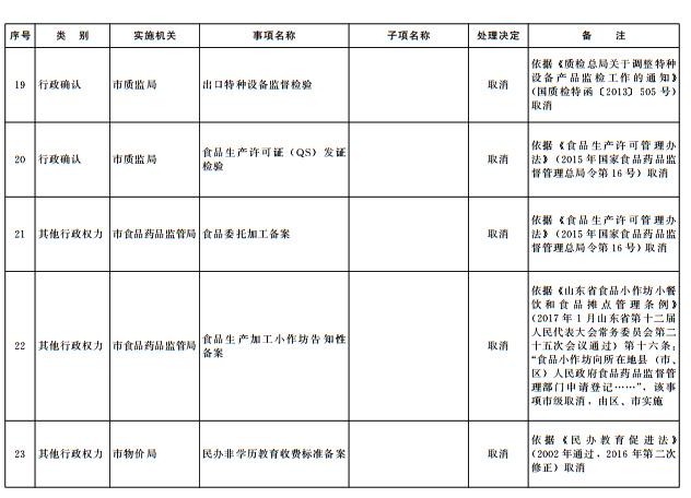 根據(jù)《國(guó)務(wù)院關(guān)于第三批取消中央指定地方實(shí)施行政許可事項(xiàng)的決定》(國(guó)發(fā)〔2017〕7號(hào))等文件精神,按照《山東省權(quán)力清單動(dòng)態(tài)管理辦法》(魯政字〔2016〕76號(hào))要求,現(xiàn)將我市2017年第四批市級(jí)行政權(quán)力事項(xiàng)調(diào)整目錄予以公布,并自公布之日起實(shí)施。