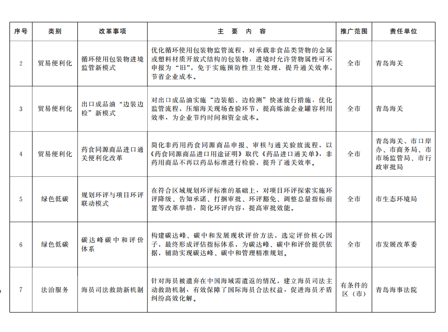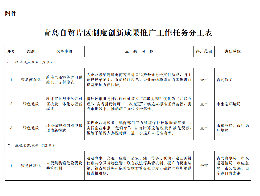 2024年以來(lái),全市各級(jí)各部門(mén)充分發(fā)揮中國(guó)(山東)自由貿(mào)易試驗(yàn)區(qū)青島片區(qū)(以下簡(jiǎn)稱(chēng)青島自貿(mào)片區(qū))改革開(kāi)放試驗(yàn)田作用,堅(jiān)持以制度創(chuàng)新為核心,大膽試、大膽闖、自主改,全力推進(jìn)自貿(mào)試驗(yàn)區(qū)改革創(chuàng)新實(shí)踐,形成了新一批制度創(chuàng)新成果。經(jīng)市政府同意,16項(xiàng)制度創(chuàng)新成果在全市推廣?,F(xiàn)就有關(guān)事宜通知如下: