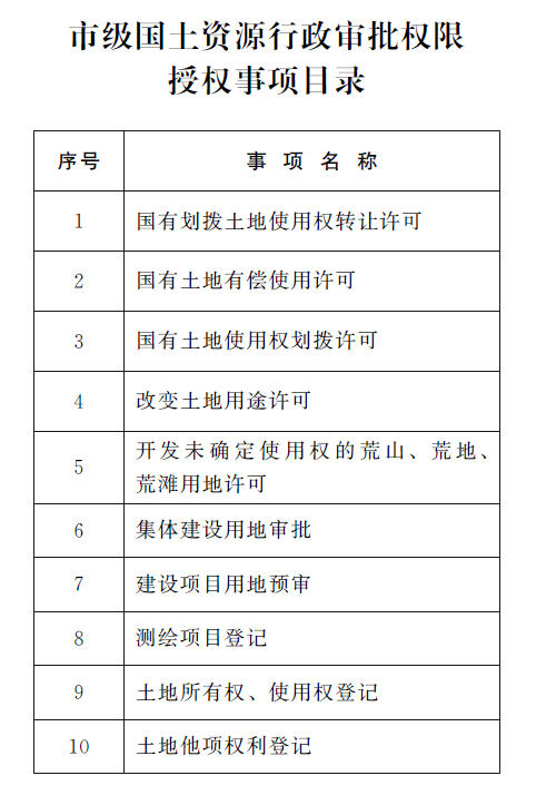 為深入貫徹落實(shí)黨的十八屆三中全會(huì)精神,深化行政審批制度改革,優(yōu)化發(fā)展環(huán)境,提高審批效率,授予青島西海岸新區(qū)(黃島區(qū))更大自主發(fā)展權(quán)、自主改革權(quán)、自主創(chuàng)新權(quán),做到新區(qū)的事新區(qū)辦,根據(jù)《中華人民共和國(guó)行政許可法》及相關(guān)法律規(guī)定,經(jīng)市政府研究決定,向青島西海岸新區(qū)(黃島區(qū))下放市級(jí)國(guó)土資源行政審批權(quán)限事項(xiàng)10項(xiàng)(見附件)。
