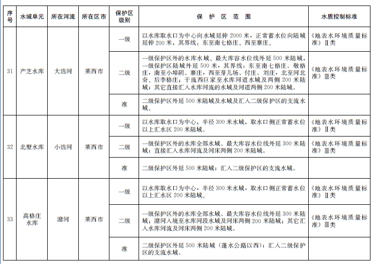 二、青島市飲用水水源保護(hù)區(qū)劃范圍共涉及全市67處飲用水水源地,其中地表水(水庫(kù)、河流)飲用水水源地60處、地下水飲用水水源地7處,主要為《青島市水功能區(qū)劃》中具有飲用水水源功能且實(shí)際日供水量1000噸以上的集中式飲用水水源地。
