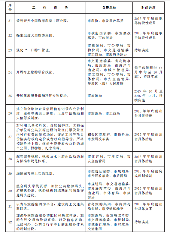 ?。ㄈ┘訌?qiáng)基礎(chǔ)設(shè)施建設(shè),完善旅游公共服務(wù)體系。依法落實(shí)差別化旅游業(yè)用地用海用島政策,優(yōu)先安排落實(shí)重點(diǎn)旅游項(xiàng)目用地和圍填海計(jì)劃指標(biāo)。編制完善海上交通規(guī)劃。整合碼頭岸線資源,加快公共旅游碼頭、游艇帆船港、帆船帆板訓(xùn)練基地和陸島交通碼頭建設(shè)。以青島旅游集團(tuán)為平臺(tái),建設(shè)海上交通集散網(wǎng)絡(luò)。加強(qiáng)外圍旅游服務(wù)功能區(qū)和集散體系、旅游專線交通和導(dǎo)識(shí)系統(tǒng),以及信息咨詢、無線網(wǎng)絡(luò)、公共自行車等目的地服務(wù)體系的規(guī)劃建設(shè)。加強(qiáng)旅游廁所建設(shè)管理,實(shí)現(xiàn)數(shù)量充足、干凈無味、使用免費(fèi)、管理有序的要求。探索建立方便、快捷、自成體系的老城區(qū)旅游交通集散系統(tǒng),實(shí)現(xiàn)重點(diǎn)旅游景區(qū)、旅游線路的旅游咨詢服務(wù)全覆蓋。