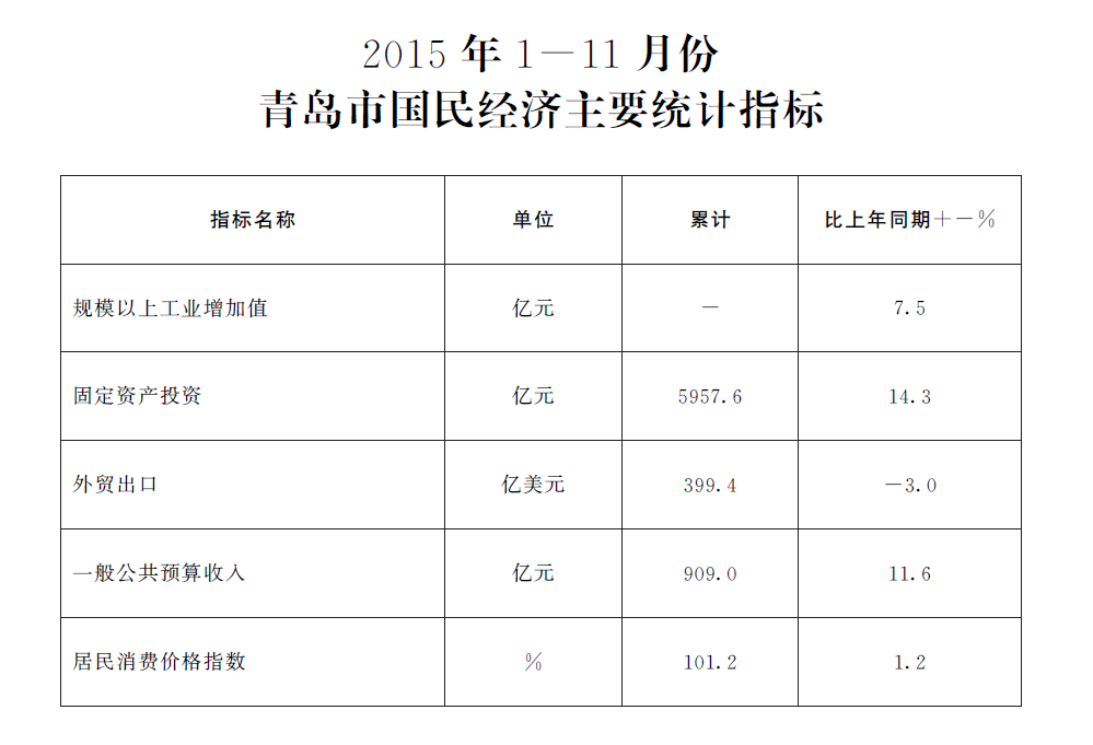 2015年1-11月份青島市國民經濟主要統(tǒng)計指標