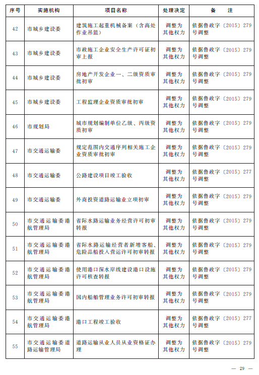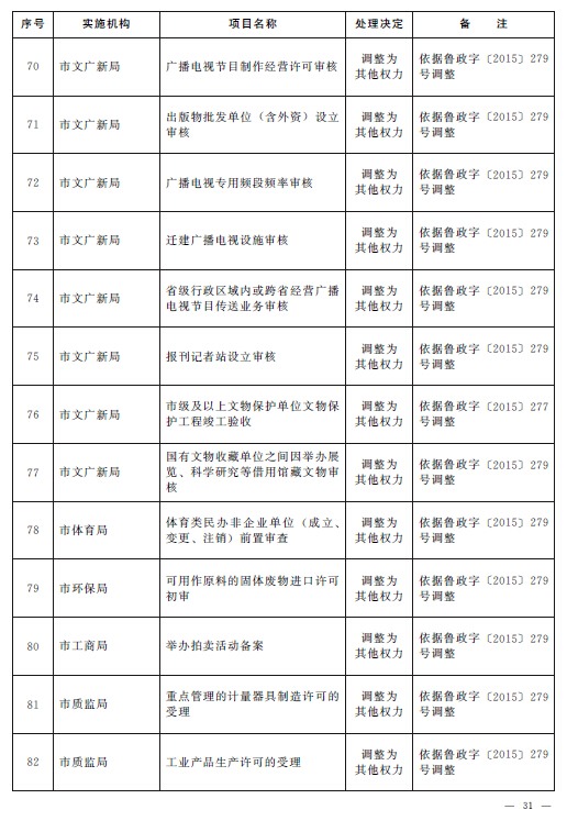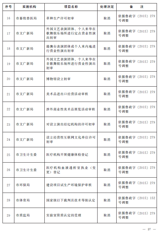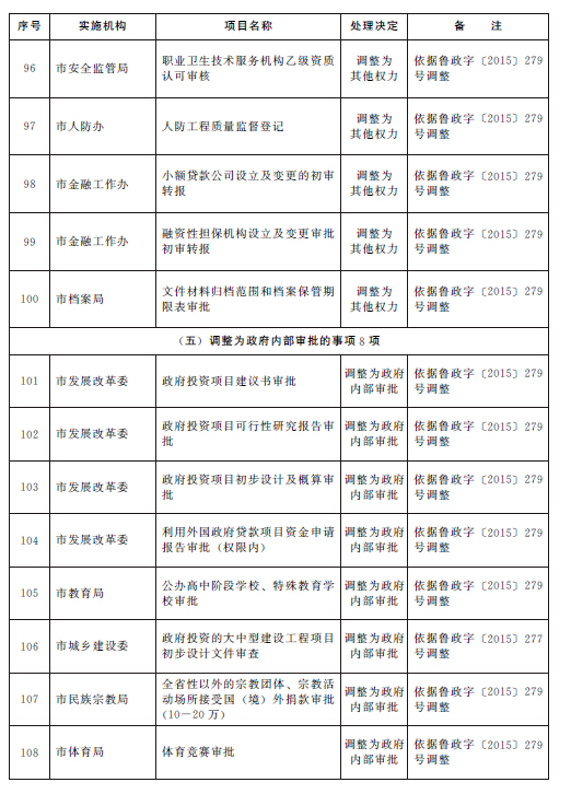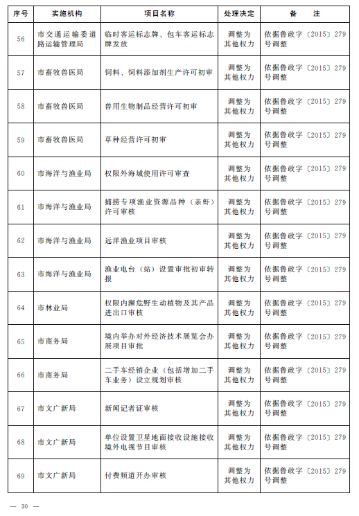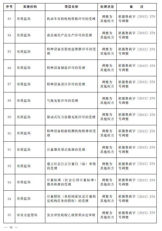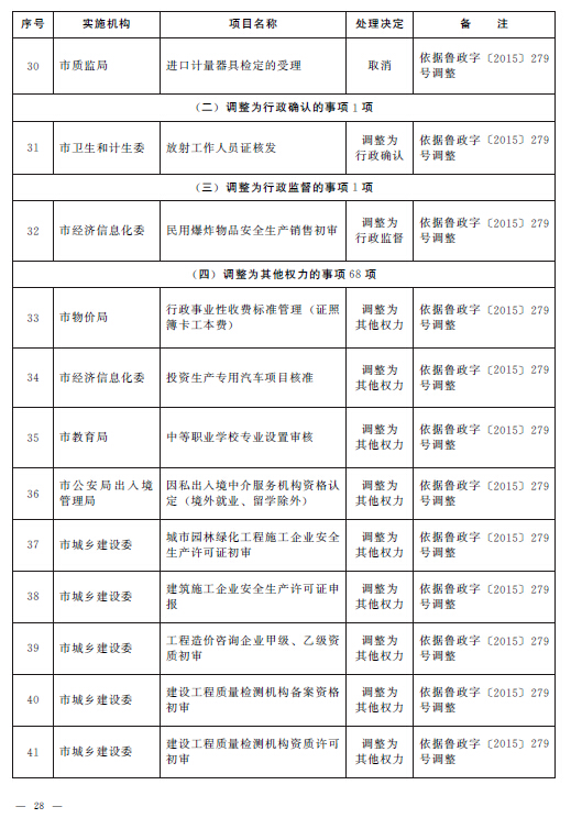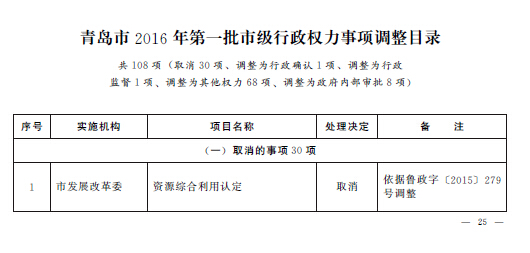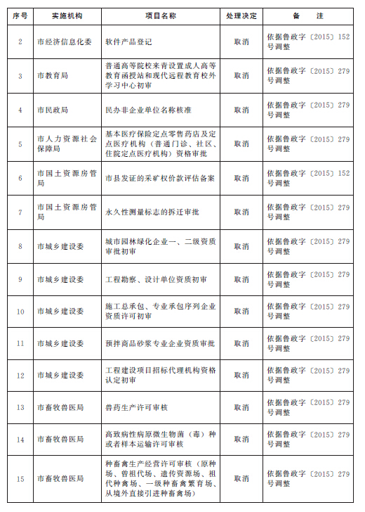 根據(jù)《山東省人民政府關(guān)于2015年第一批省級(jí)削減行政審批事項(xiàng)和承接國務(wù)院下放行政審批事項(xiàng)等項(xiàng)目的通知》(魯政字〔2015〕152號(hào))、《山東省人民政府關(guān)于2015年第二批削減省級(jí)行政審批事項(xiàng)的通知》(魯政字〔2015〕277號(hào))和《山東省人民政府關(guān)于清理市縣實(shí)施非行政許可審批事項(xiàng)有關(guān)問題的通知》(魯政字〔2015〕279號(hào)),結(jié)合《山東省人民政府關(guān)于印發(fā)山東省行政權(quán)力清單動(dòng)態(tài)管理辦法的通知》(魯政字〔2016〕76號(hào))和《青島市人民政府關(guān)于公布青島市市級(jí)行政權(quán)力清單的通知》(青政字〔2015〕2號(hào))對(duì)市級(jí)行政權(quán)力清單實(shí)行動(dòng)態(tài)管理的要求,現(xiàn)將我市2016年第一批市級(jí)行政權(quán)力事項(xiàng)調(diào)整目錄予以公布,并自公布之日起實(shí)施。