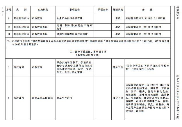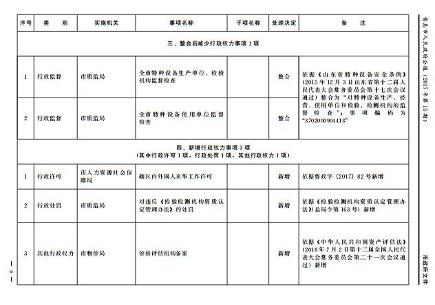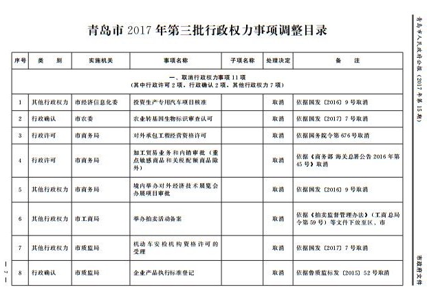 根據(jù)《國(guó)務(wù)院關(guān)于第三批取消中央指定地方實(shí)施行政許可事項(xiàng)的決定》(國(guó)發(fā)〔2017〕7號(hào))、《山東省人民政府關(guān)于2017年第一批削減省級(jí)行政權(quán)力事項(xiàng)和清理規(guī)范行政審批中介服務(wù)收費(fèi)項(xiàng)目的通知》(魯政字〔2017〕82號(hào)),按照《山東省權(quán)力清單動(dòng)態(tài)管理辦法》(魯政字〔2016〕76號(hào))要求,現(xiàn)將我市2017年第三批市級(jí)行政權(quán)力事項(xiàng)調(diào)整目錄予以公布,并自公布之日起實(shí)施。