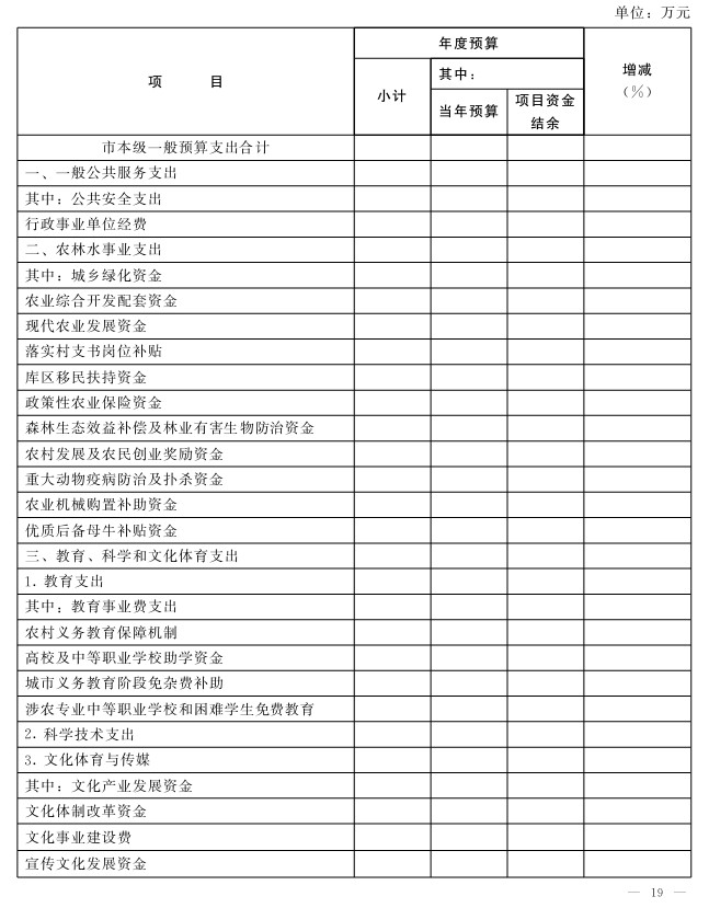 財(cái)政部門(mén)應(yīng)在市人民代表大會(huì)批準(zhǔn)當(dāng)年財(cái)政預(yù)算草案后30個(gè)工作日內(nèi),主動(dòng)公開(kāi)政府財(cái)政總預(yù)算(涉密事項(xiàng)除外)。公開(kāi)內(nèi)容包括政府財(cái)政預(yù)算報(bào)告、一般預(yù)算收入草案表、一般預(yù)算支出草案表、基金收入預(yù)算草案表、基金支出預(yù)算草案表等(參考表見(jiàn)附件一、二、三、四)。