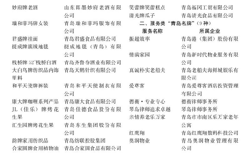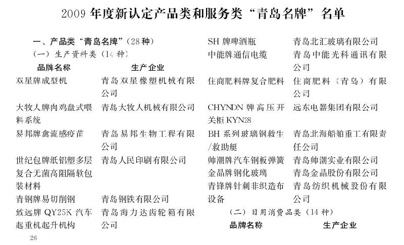 2009年度新認(rèn)定產(chǎn)品類(lèi)和服務(wù)類(lèi)“青島名牌”名單
