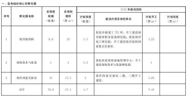 2016年底前,引進(jìn)國家省部級(jí)實(shí)驗(yàn)室、企業(yè)研發(fā)中心、企業(yè)工程技術(shù)中心不少于50家,完成涉藍(lán)領(lǐng)域400萬平米孵化器、8個(gè)公共研發(fā)平臺(tái)和專家公寓、商務(wù)休閑等各類配套設(shè)施建設(shè)。