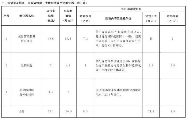 2012年:計(jì)劃投資8.3億元,開工建設(shè)21.8萬平米孵化器,建成4.8萬平米。其中,依托青島高科產(chǎn)業(yè)發(fā)展有限公司,開工建設(shè)青島國際創(chuàng)新園(一期)17萬平米孵化器;依托中國聯(lián)通青島分公司,建設(shè)云計(jì)算中心;依托青島浮昌實(shí)業(yè)總公司,在國家生物產(chǎn)業(yè)基地內(nèi)建設(shè)生物制造孵化器,年內(nèi)完成主體建筑。