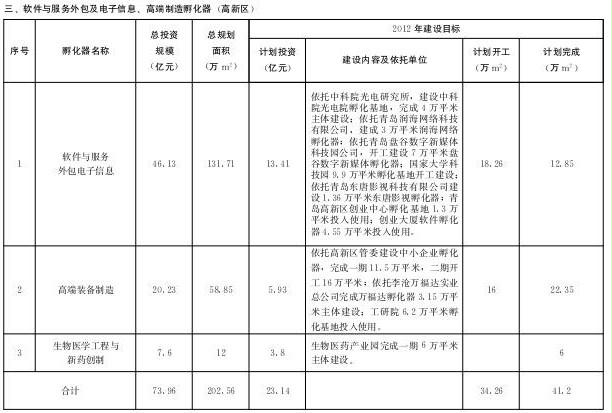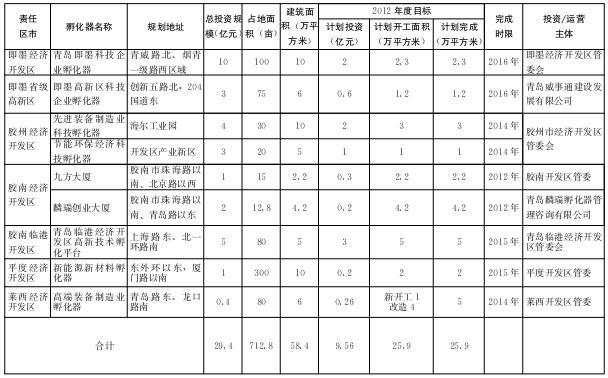 2012年:計(jì)劃投資9.56億元,在先進(jìn)制造、節(jié)能環(huán)保、新能源新材料、信息技術(shù)等領(lǐng)域共開工建設(shè)25.9萬平米孵化器。其中膠州4萬平米、即墨3.5萬平米、膠南11.4萬平米、平度2萬平米、萊西5萬平米。