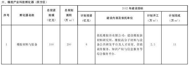 2016年底前,投資100億元以上,完成橡膠材料與設(shè)備等領(lǐng)域共計(jì)200萬平米以上孵化器及相關(guān)配套設(shè)施建設(shè)。
