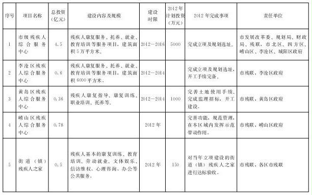 2012年:李滄區(qū)殘疾人綜合服務(wù)中心開工建設(shè)。嶗山區(qū)殘疾人綜合服務(wù)中心實(shí)現(xiàn)功能完善,管理規(guī)范,在本區(qū)域內(nèi)發(fā)揮示范帶動(dòng)作用。黃島區(qū)殘疾人綜合服務(wù)中心完成項(xiàng)目監(jiān)理招標(biāo)及進(jìn)場(chǎng)開工工作。