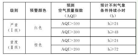 紅色(Ⅰ級)預(yù)警:預(yù)測未來空氣質(zhì)量指數(shù)(AQI)超過300,且預(yù)計不利氣象條件持續(xù)48小時以上;預(yù)測未來空氣質(zhì)量指數(shù)(AQI)超過500,且預(yù)計不利氣象條件持續(xù)24小時以上。