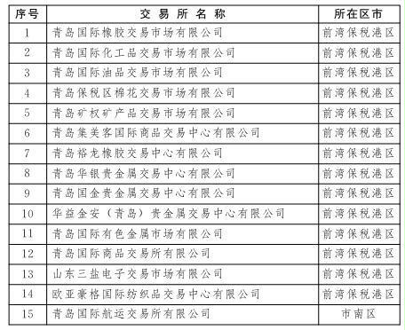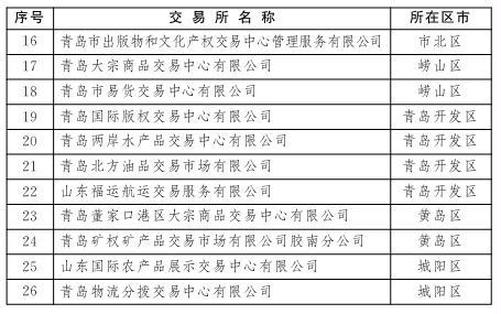 為規(guī)范發(fā)展各類交易場所,切實防范金融風險,更好地服務實體經(jīng)濟,根據(jù)《國務院關于清理整頓各類交易場所切實防范金融風險的決定》(國發(fā)〔2011〕38號)和《國務院辦公廳關于清理整頓各類交易場所的實施意見》(國辦發(fā)〔2012〕37號)等文件精神,經(jīng)清理規(guī)范,并通過清理整頓各類交易場所部際聯(lián)席會議檢查驗收,市政府同意保留青島產(chǎn)權交易所等29家交易場所(名單附后),現(xiàn)予公布。