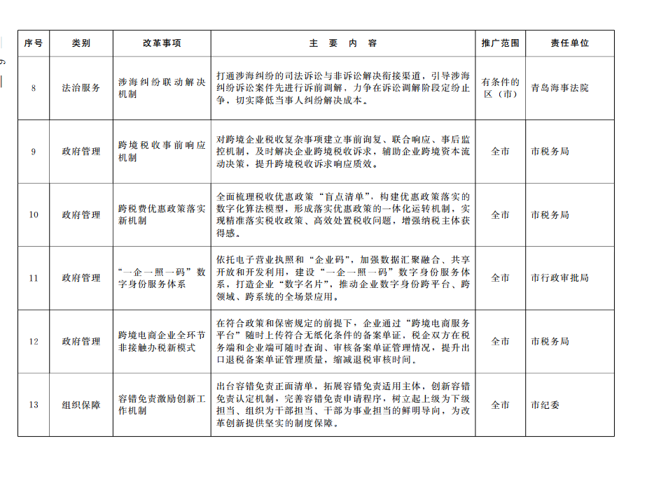 2024年以來,全市各級(jí)各部門充分發(fā)揮中國(山東)自由貿(mào)易試驗(yàn)區(qū)青島片區(qū)(以下簡稱青島自貿(mào)片區(qū))改革開放試驗(yàn)田作用,堅(jiān)持以制度創(chuàng)新為核心,大膽試、大膽闖、自主改,全力推進(jìn)自貿(mào)試驗(yàn)區(qū)改革創(chuàng)新實(shí)踐,形成了新一批制度創(chuàng)新成果。經(jīng)市政府同意,16項(xiàng)制度創(chuàng)新成果在全市推廣。現(xiàn)就有關(guān)事宜通知如下: