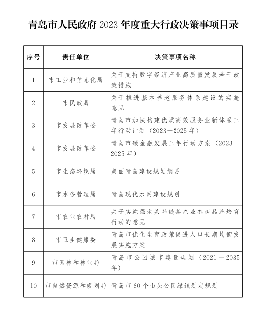 為進一步規(guī)范重大行政決策程序,促進政府科學、民主、依法決策,提高決策質(zhì)量和效率,根據(jù)《青島市重大行政決策程序規(guī)定》(市政府令第271號)要求,市政府辦公廳組織市政府各部門對2023年重點工作事項進行了梳理,篩選出具有基礎(chǔ)性、全局性和影響面廣的10項決策事項,已經(jīng)市委、市政府同意,現(xiàn)納入青島市人民政府2023年度重大行政決策事項范圍,實行目錄清單管理。列入清單管理的決策事項須于2023年11月30日前完成。各有關(guān)部門和單位要嚴格按照公眾參與、專家論證、風險評估、合法性審查的法定程序開展前期工作,并適時提交市政府常務會議研究。