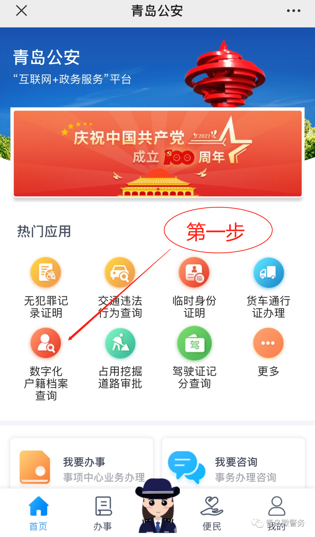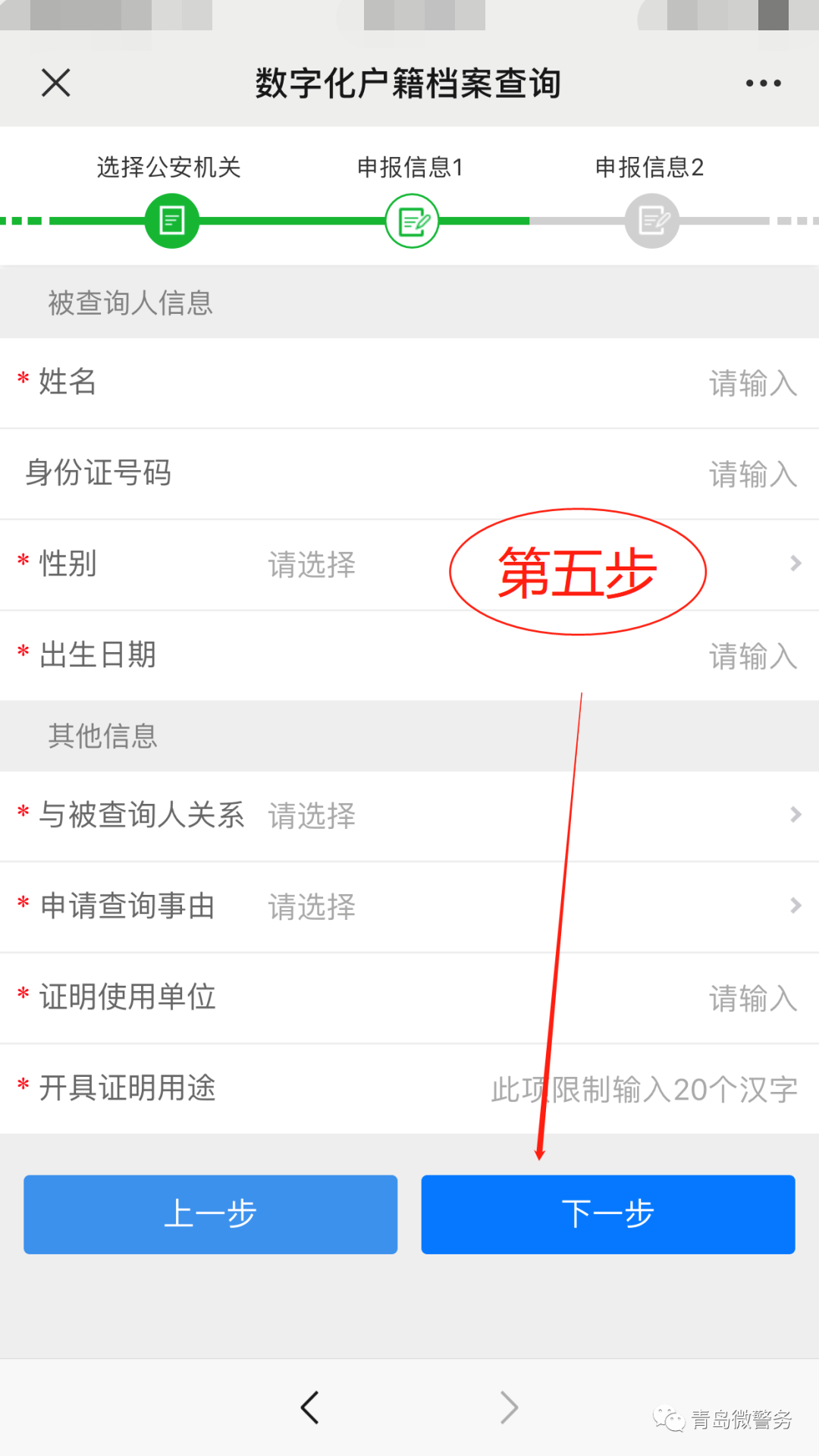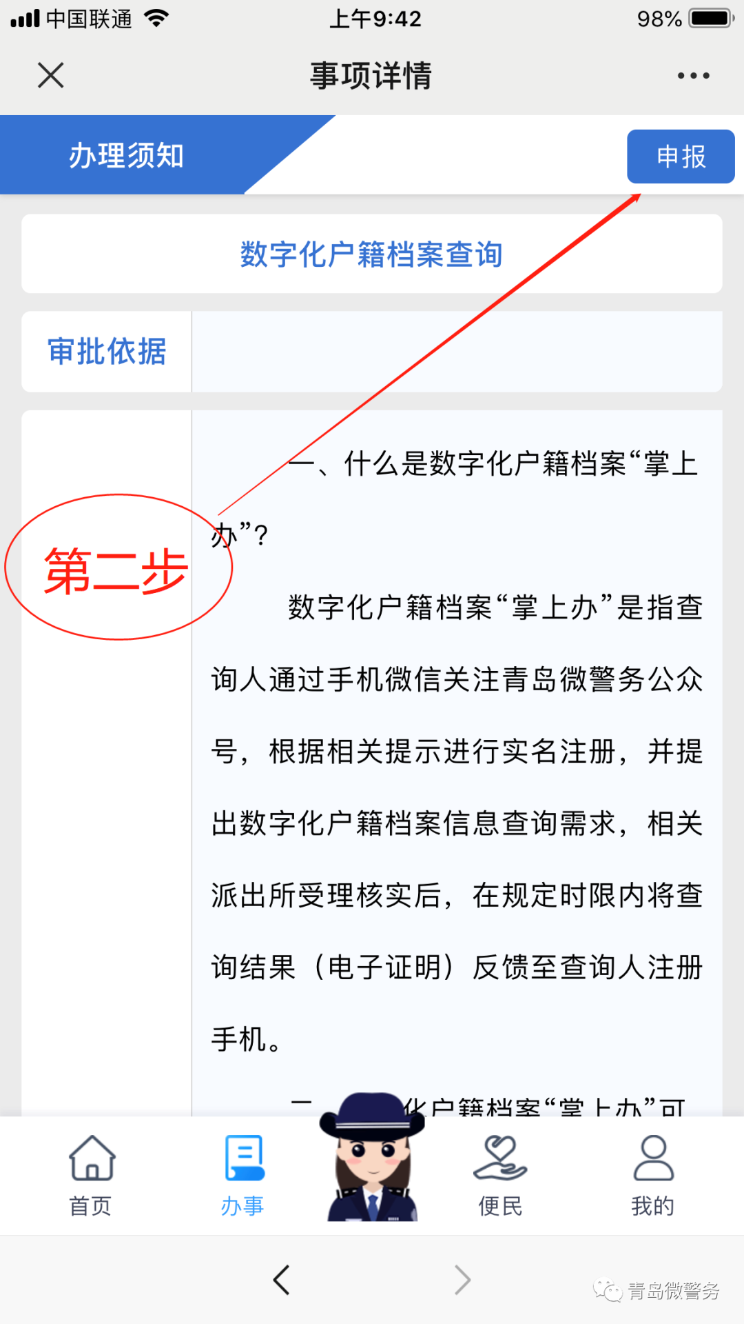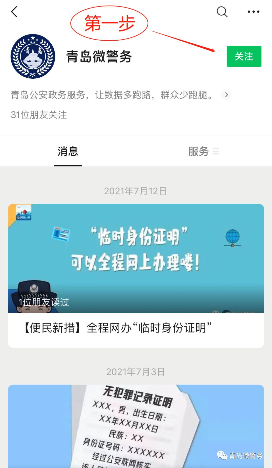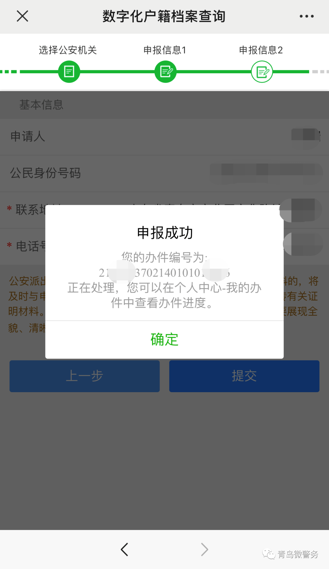 申請(qǐng)人關(guān)注“青島微警務(wù)”公眾號(hào),通過(guò)“刷臉”認(rèn)證對(duì)其身份進(jìn)行認(rèn)證后,即可提交申請(qǐng)查詢與本人有關(guān)的數(shù)字化戶籍檔案需求。示范如下: