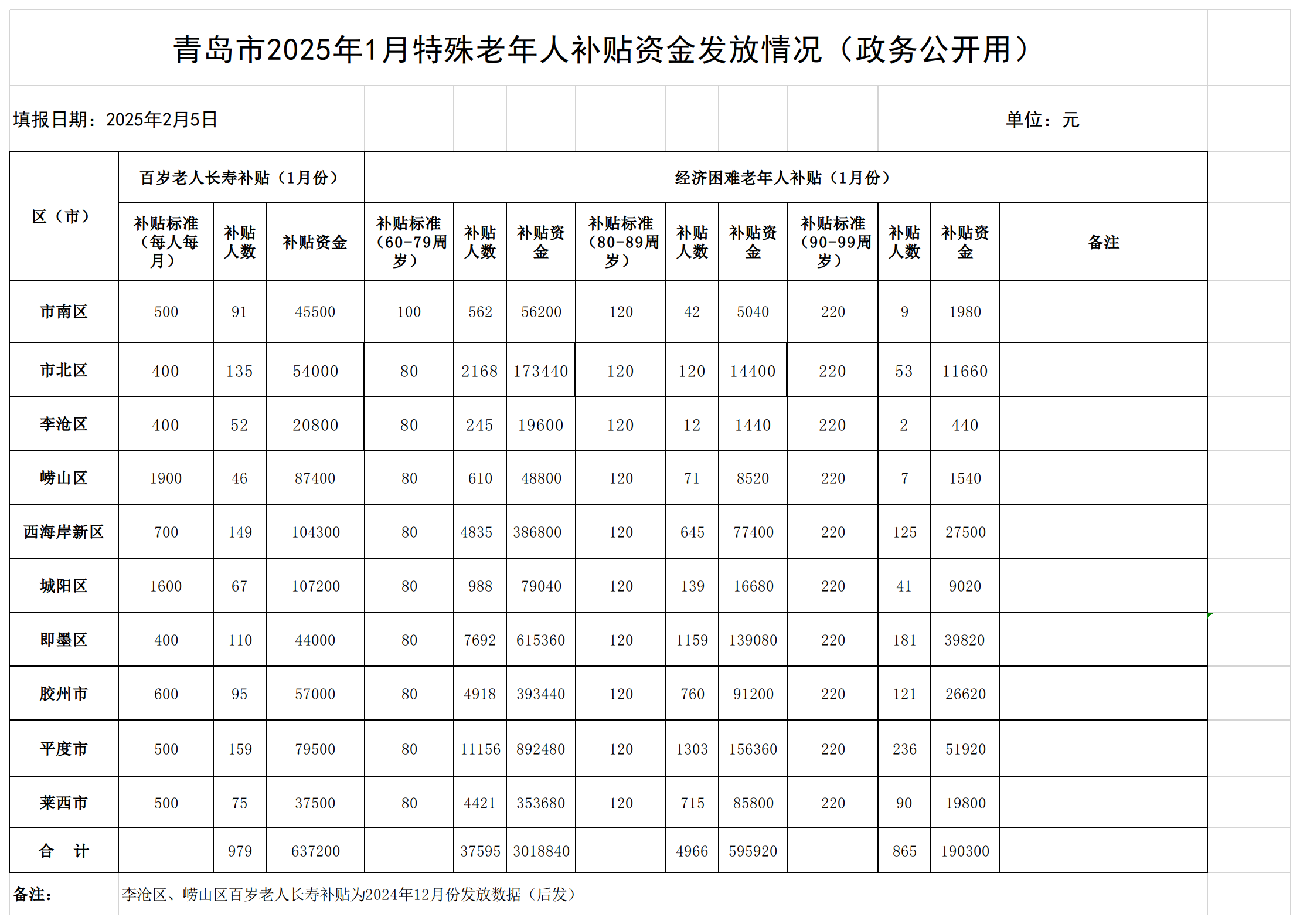 青島市2025年1月特殊老年人補(bǔ)貼資金發(fā)放情況