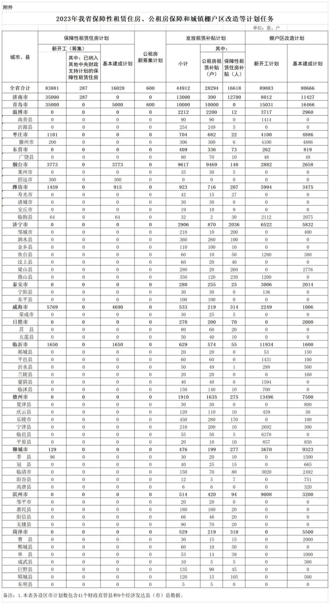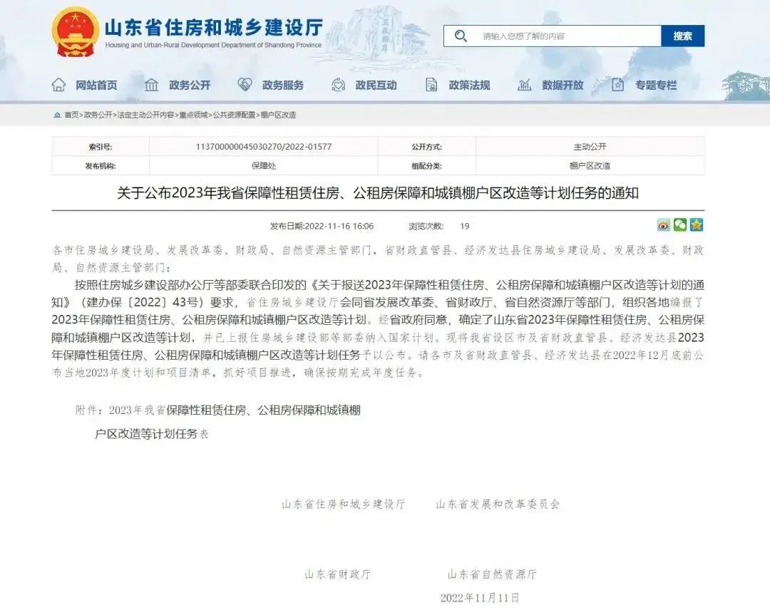日前,山東省住房和城鄉(xiāng)建設(shè)廳官網(wǎng)發(fā)布了《關(guān)于公布2023年我省保障性租賃住房、公租房保障和城鎮(zhèn)棚戶區(qū)改造等計劃任務(wù)的通知》。