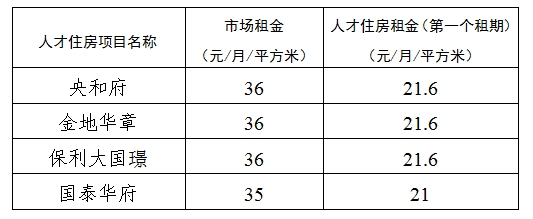 人才住房租賃價(jià)格保障標(biāo)準(zhǔn)內(nèi)及超出保障標(biāo)準(zhǔn)50%以?xún)?nèi)建筑面積按優(yōu)惠租金計(jì)算,剩余部分建筑面積按市場(chǎng)租金收取。按照有關(guān)規(guī)定,本次分配的租賃型人才住房每3年一個(gè)租期,承租人首個(gè)租期優(yōu)惠租金標(biāo)準(zhǔn)按照同區(qū)域住房市場(chǎng)租金的60%確定。期滿(mǎn)后符合條件可續(xù)租一次,租期不超過(guò)3年,租金標(biāo)準(zhǔn)按照不高于同區(qū)域住房市場(chǎng)租金的80%確定;續(xù)租期滿(mǎn)后確需繼續(xù)租賃的,租金標(biāo)準(zhǔn)按同區(qū)域住房市場(chǎng)租金確定。水、電、燃?xì)狻⑴瘹?、有線電視、電信、衛(wèi)生、物業(yè)管理及其他相關(guān)費(fèi)用由承租人按規(guī)定另行交納。